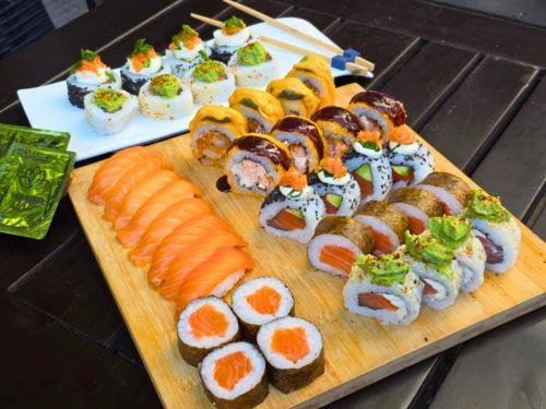 8 Kanemochi(salmón, phila, palta, y togarashi)- 8 Nigiris- 8 Shakemaki(Salmón, phila y ciboulette) - 8 Oishi (Salmón, palta, phila, salmón y ciboulette)- 8 Langostino Bs.as (Langostino y phila, palta y mayo picante). Incluye: 4 Palitos / 4 Soja o Salsa Bs