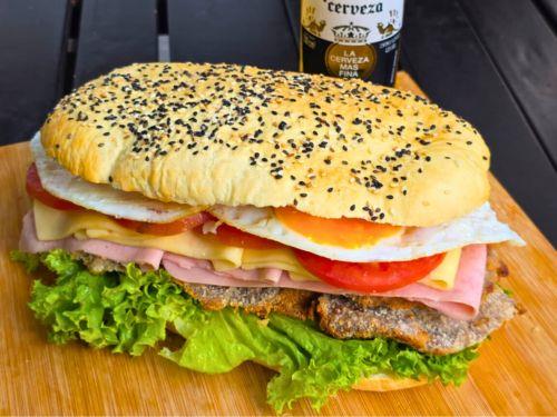 Sandwich de milanesa de carne, con lechuga, tomate, huevo, jamón y queso. Servido en pan de pizza.