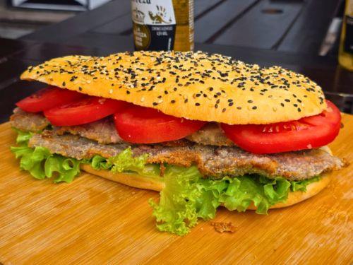 Sandwich de milanesa de carne, con lechuga, tomate. Servido en pan de pizza.