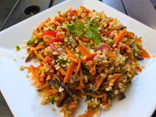 Salteado de arroz yamani con verduras de estación y salsa de soja.