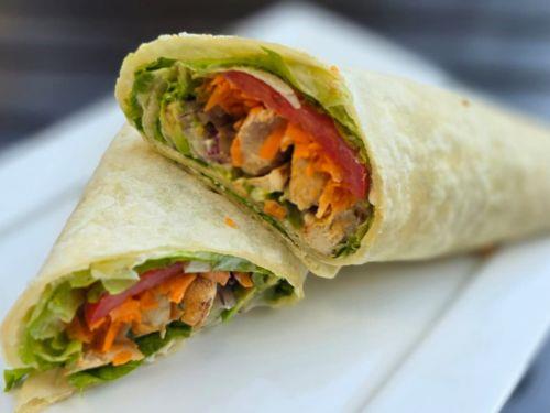 Wrap de pollo, lechuga, tomate, palta, cebolla, zanahoria, y mayonesa.