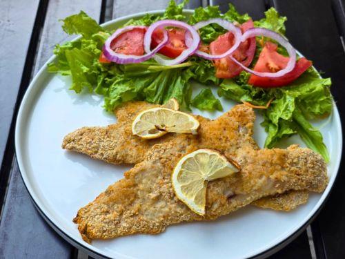 Filet rebozado con ensalada lechuga, tomate y cebolla.