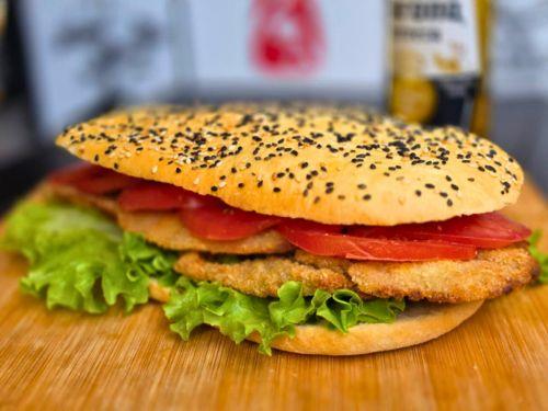 Sandwich de milanesa de pollo, con lechuga, tomate. Servido en pan de pizza.