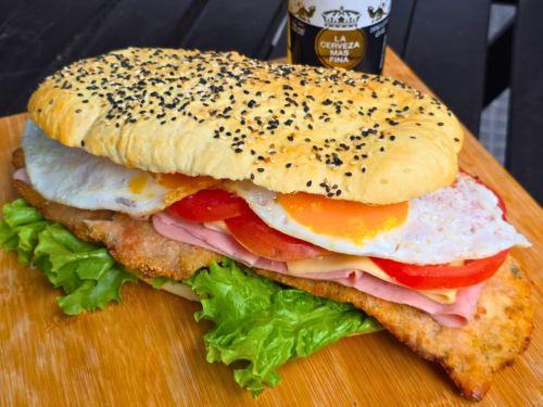Sandwich de milanesa de pollo, con lechuga, tomate, huevo, jamon y queso. Servido en pan de pizza.