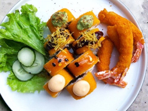 Increíble combinación de sabores. 8 sushi hot rolls + 4 deliciosos bastones de langostinos.