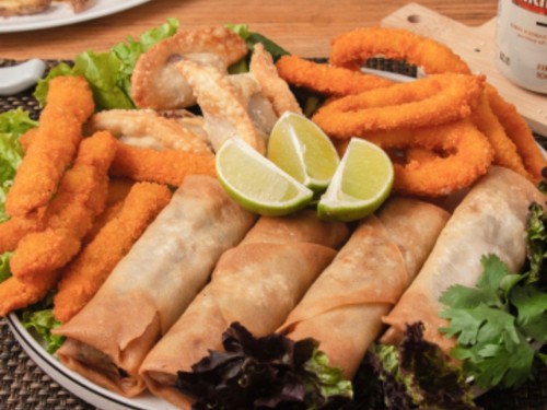 Tabla con; 4 arrollados verdura, 1/2 porción rabas, 4 bastones de langostinos, 4 gyozas de salmón fritas.