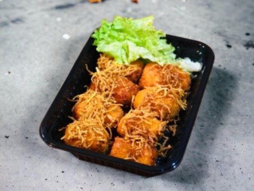 Bocado de salmón y queso phila, rebozado en panko. Con salsa de maracuyá y batatitas.