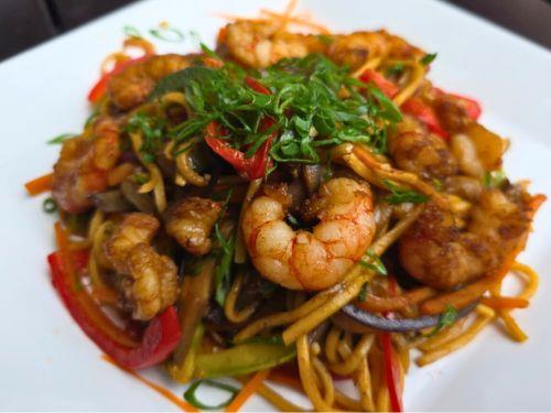 Delicado salteado de fideos al huevo con langostinos, verduras de estación y hongos al wok.