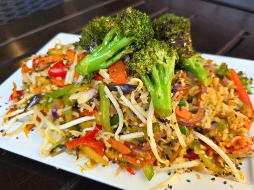Wok de arroz, verduras de estación y salsa de soja.