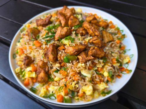 Arroz salteado al wok con pollo, arroz, huevo, zanahoria, verdeo y salsa de soja.