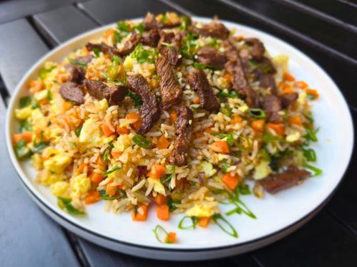 Arroz salteado al wok con tiras de carne y pollo, arroz, huevo, zanahoria y cebolla de verdeo, terminado con un toque de salsa de soja.