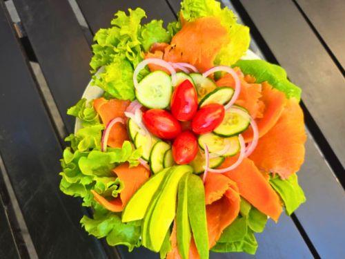 Una ensalada de salmón fresco con un mix de hojas es una opción deliciosa y saludable. Salmón fresco, mix de hojas frescas, pepino, palta, cebolla morada, tomates cherry, y semillas de sésamo.