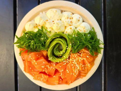 Arroz + palta + salmón fresco + queso phila + Verdeo. Rica y saludable.