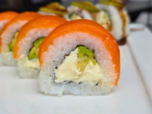 Queso philadelphia y palta, cubierto de salmón fresco.