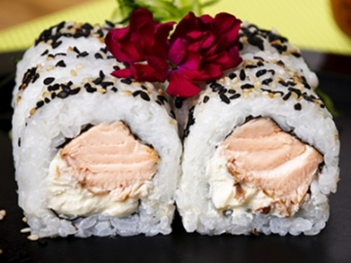 Roll de salmón cocido, queso philadelphia y semillas de sésamo. SIN TACC.