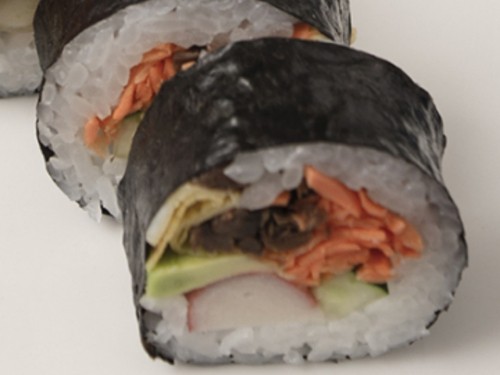 Roll de Kanikama, zanahoria, tamago, pepino, palta y hongos shitake. SIN TACC.