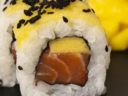Roll de salmón fresco, mango y semillas de sésamo. SIN TACC.
