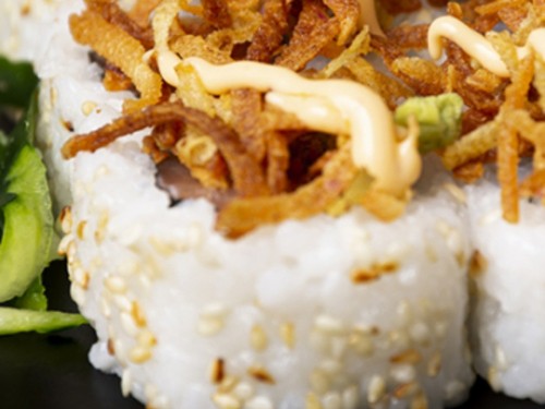 Roll de salmón fresco, coronado con mayonesa spicy, batatas crunch y semillas de sésamo. SIN TACC.
