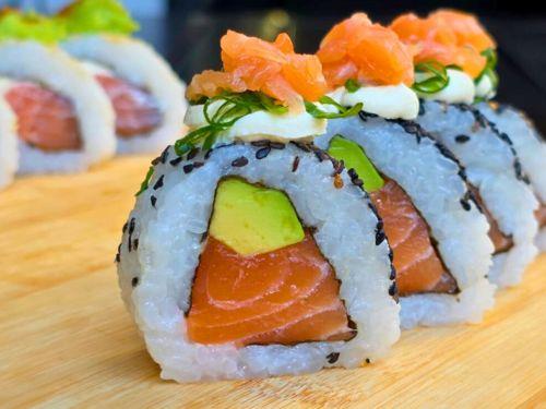 Roll de salmón fresco y palta, coronado con queso philadelphia, salmón y verdeo. SIN TACC.