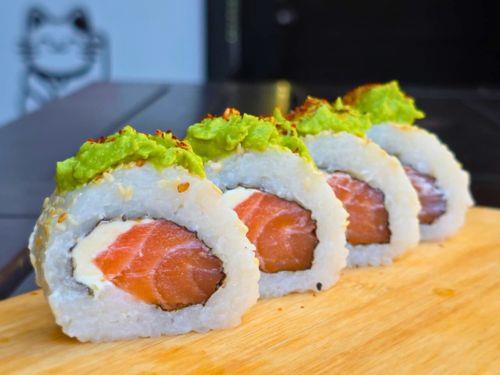 Roll de salmón fresco y queso philadelphia, coronado con palta y togarashi. SIN TACC.