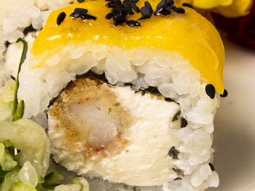Roll de langostino apanado con panko frito, queso philadelphia, cubierto en mango y semillas de sésamo.