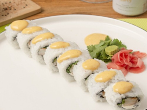 Roll langostino y queso philadelphia, coronado con mostaza y miel. SIN TACC.