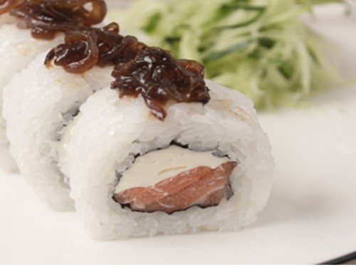 Roll de salmón, queso philadelphia y cebolla caramelizada. SIN TACC.