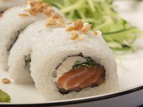 Roll de salmón, queso philadelphia y rúcula, coronado con praliné. SIN TACC.