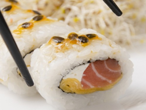 Salmón, phila y mango, con salsa de maracuyá.