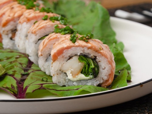 Langostino y rúcula cubierto con salmón flambeado con teriyaki y ciboulette.