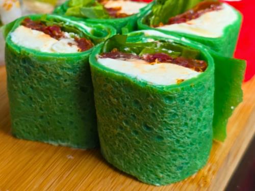 Roll de rúcula, tomates especiados, y queso philadelphia, envuelto en lámina de huevo. SIN TACC.