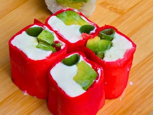 Roll de verdeo, queso philadelphia y palta, envuelto en lámina de huevo. SIN TACC.