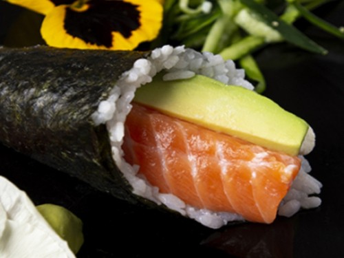 Cono de alga nori con arroz, salmón, queso phila y palta, con semillas de sésamo.